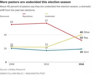 Pastors were more firmly in the Republican camp. Source: Donald Trump’s pastor problem: 40 percent of Protestant ministers are still undecided – The Washington Post